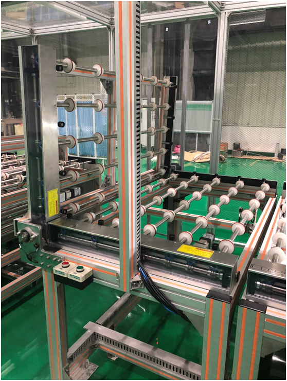 本裝置為太陽能電池生產(chǎn)線中工藝設備與工藝設備連接時的基板傳輸裝置。裝置采用西門子1200控制系統(tǒng)和伺服電機作傳輸動力,精密不銹鋼軸及POM傳輸輪+O型圈進行滾輪方式輸送,并使用反射型光電傳感器識別傳輸基板,與上游連接信號對接,起點傳感器感應到基板電機傳動,到達減速點減速,到達終點停止,未到達相應位置報警,與下游連接信號對接,基板完全脫離終點傳感器電機停止轉(zhuǎn)動,下游有故障,自動停止報警。該傳輸機采用變頻電機翻轉(zhuǎn),空間結(jié)構(gòu)合理,完全達到90°。 |