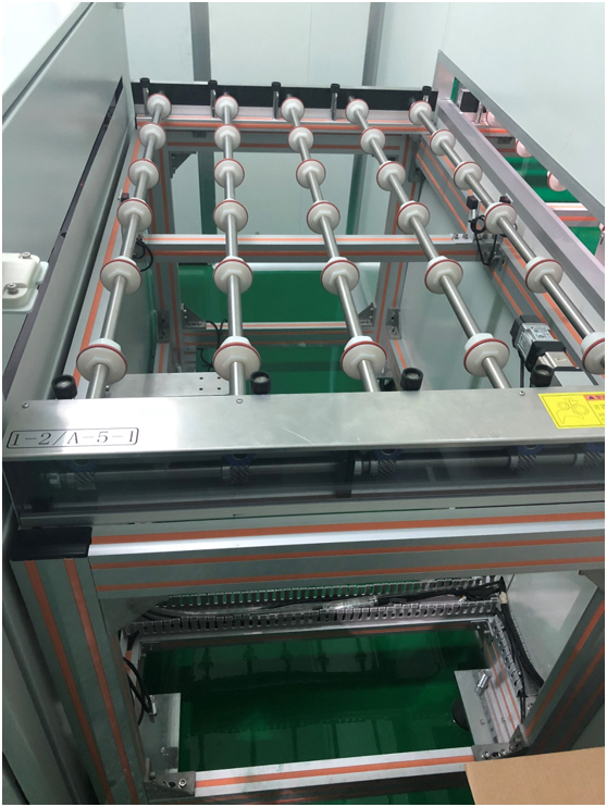 本裝置為太陽能電池生產(chǎn)線中工藝設(shè)備與工藝設(shè)備連接時(shí)的基板傳輸裝置。裝置采用西門子1200控制系統(tǒng)和伺服電機(jī)作傳輸動(dòng)力,精密不銹鋼軸及POM傳輸輪+O型圈進(jìn)行滾輪方式輸送,并使用反射型光電傳感器識(shí)別傳輸基板,與上游連接信號(hào)對(duì)接,起點(diǎn)傳感器感應(yīng)到基板電機(jī)傳動(dòng),到達(dá)減速點(diǎn)減速,到達(dá)終點(diǎn)停止,未到達(dá)相應(yīng)位置報(bào)警,與下游連接信號(hào)對(duì)接,基板完全脫離終點(diǎn)傳感器電機(jī)停止轉(zhuǎn)動(dòng),下游有故障,自動(dòng)停止報(bào)警。 |