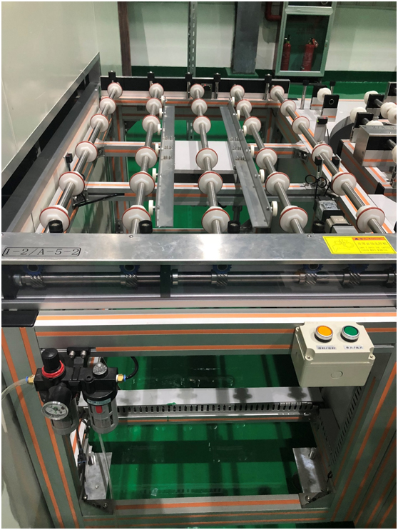 本裝置為太陽能電池生產(chǎn)線中工藝設(shè)備與工藝設(shè)備連接時的基板傳輸裝置。裝置采用西門子1200控制系統(tǒng)和伺服電機作傳輸動力,精密不銹鋼軸及POM傳輸輪+O型圈進行滾輪方式輸送,并使用反射型光電傳感器識別傳輸基板,與上游連接信號對接,起點傳感器感應(yīng)到基板電機傳動,到達減速點減速,到達終點停止,未到達相應(yīng)位置報警,與下游連接信號對接,基板完全脫離終點傳感器電機停止轉(zhuǎn)動,下游有故障,自動停止報警。該傳輸機具備人工單片進料、單片出料、連片進料、連片出料功能。 |