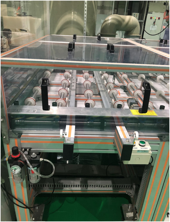 本裝置為太陽能電池生產線中工藝設備與工藝設備連接時的基板傳輸裝置。裝置采用西門子1200控制系統(tǒng)和伺服電機作傳輸動力,精密不銹鋼軸及POM傳輸輪+O型圈進行滾輪方式輸送,并使用反射型光電傳感器識別傳輸基板,與上游連接信號對接,起點傳感器感應到基板電機傳動,到達減速點減速,到達終點停止,未到達相應位置報警,與下游連接信號對接,基板完全脫離終點傳感器電機停止轉動,下游有故障,自動停止報警。該傳輸機具備人工單片進料、單片出料、連片進料、連片出料功能。六面密封減少車間粉塵對基板的污染。